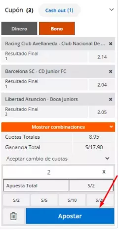 Elije entre las opciones: jugar con el saldo "Efectivo" o con el "Bono". Revisa tu apuesta y haz clic en el botón "Apostar". En el talón de apuestas también puedes elegir entre apuestas simples, múltiples o combinadas.